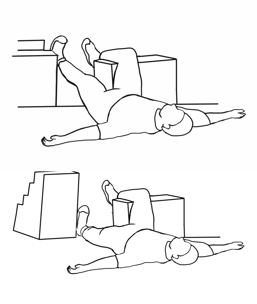 Feküdjön a hátára, egyik lábát helyezze egy dobozra vagy székre, derékszögben behajlítva. A másik láb legyen kinyújtva és megemelve, elég magasan ahhoz, hogy a hát és a csípő laposan feküdjön a földön. A lábfej a sarkon támaszkodik. Kinyújtott lábának a lábfejét feszítse meg, hogy meg akadályozza az oldalra fordulását. A cél az, hogy a kinyújtott láb fokozatosan süllyed jen le 15-20 cm-t, amíg le nem ér a földre. Miközben lefelé süllyeszti a lábát, lazítsa el a földön a hátát. Ne akarja, hogy a háta ellaposodjon – hagyja természetes módon mozogni. Tartsa meg ezt a pozíciót lépésenként legalább három percig. Ismételje meg a másik lá bával. Ez a gyakorlat inkább a láb hajlításának és feszítésének gyakorlására van ki találva, mint a közelítő és a távolító izmok segítségével megvalósuló forgás megvalósításához.
