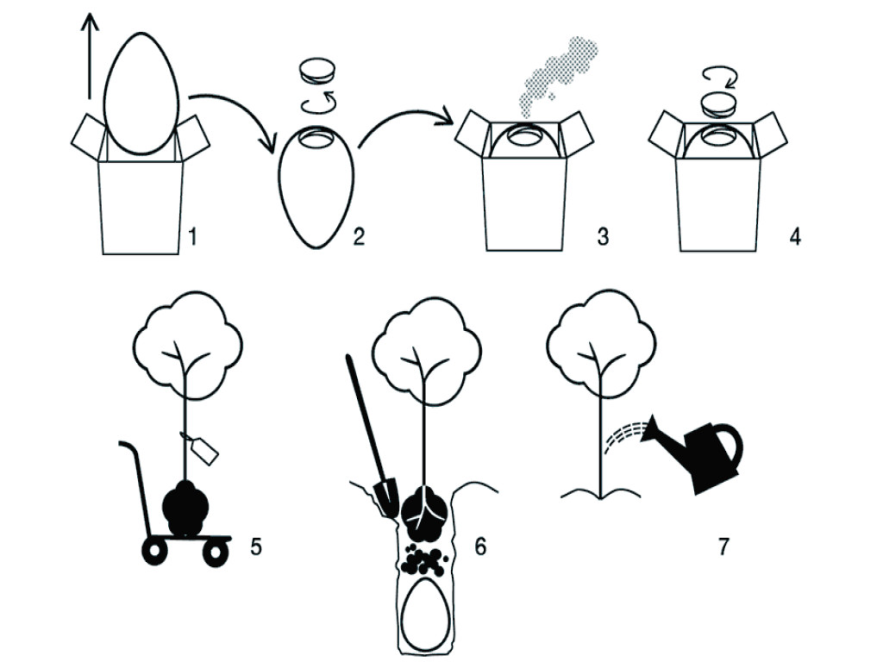 Ezután a kapszulát mintegy magot, elültetik a földbe, majd a tetejére egy facsemetét ültetnek. A fa gyökere ez idők folyamán körülöleli a kapszulát, ami tápanyagként szolgál majd neki.