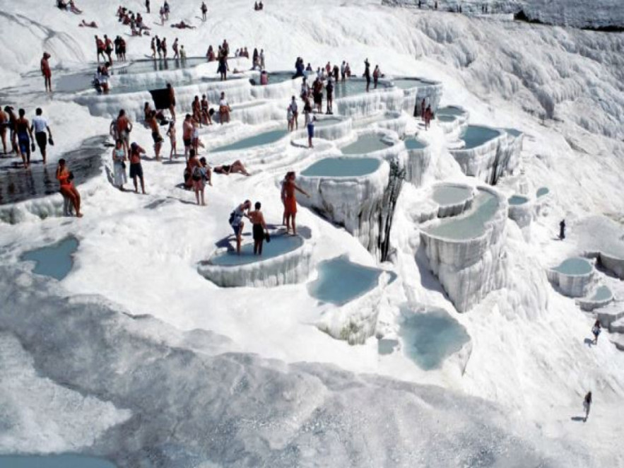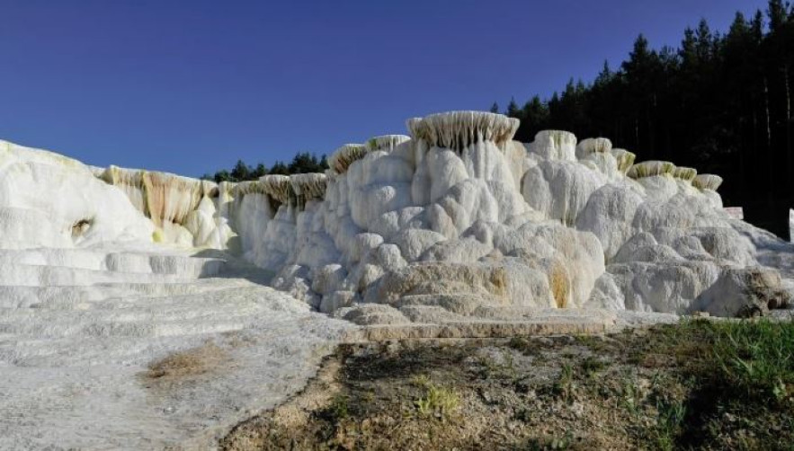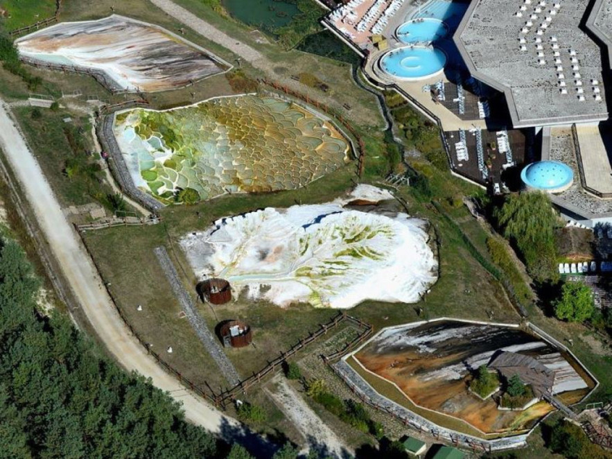 Valójában ez mésztufa, ami a felszínre kerülő, majd lehűlő termálvízből válik ki. A felszínre kerülő vízben ugyanis az oldott kalcium-hidrogén-karbonátból kalcium-karbonát – azaz mészkő – válik ki. Ez a folyamat annál gyorsabb, minél előbb távozik a vízből az oldott szén-dioxid, ezt pedig a víz hűlése segíti elő. A vízből kiváló mészkő eleinte puha lesz, majd fokozatosan megszilárdul, az ezen látható “színes” részek pedig a kifolyó vízben gyorsan megtelepedő algáknak köszönhetők. Ezek egyébként szintén segítik a mészkő megszilárdulását, ugyanis csökkentik a víz szén-dioxid tartalmát.