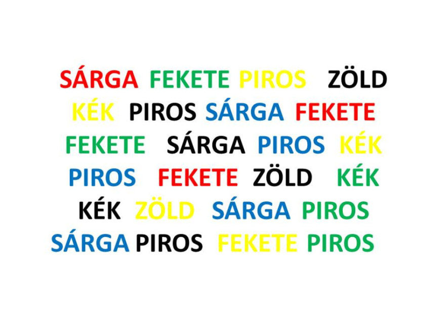 Fent láthatsz egy szólistát: színeket, de mindegyiket más színnel írtuk, mint amit valójában jelent a szó. Kezdd el hangosan mondani azt a színt, amilyen színnel leírtuk a szavakat! Aztán fordítva: olvasd fel a színeket!