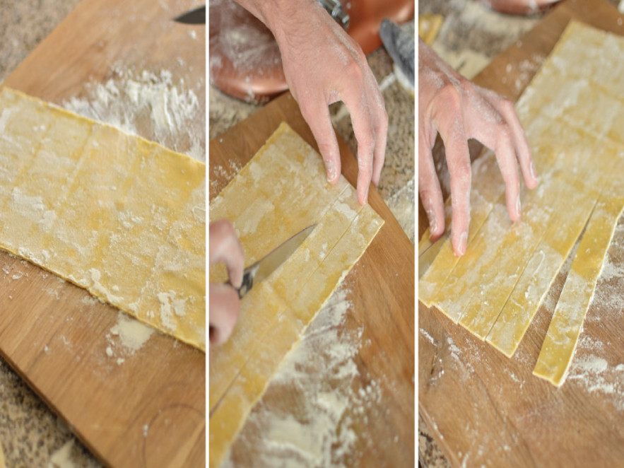 Körülbelül fél órai szikkasztás után liszttel meghintem, rácsavarom a nyújtófára, amelyet a gyúródeszkára helyezek. Vigyázok, ne száradjon ki, mert akkor nem lehet vágni. Késsel, hosszában végigvágom, majd a tésztalapokat egymásra téve még egyszer elvágom. Az ily módon kapott tésztacsíkokat egymásra rakom, és aszerint vágom fel, milyen tésztát akarok belőle.