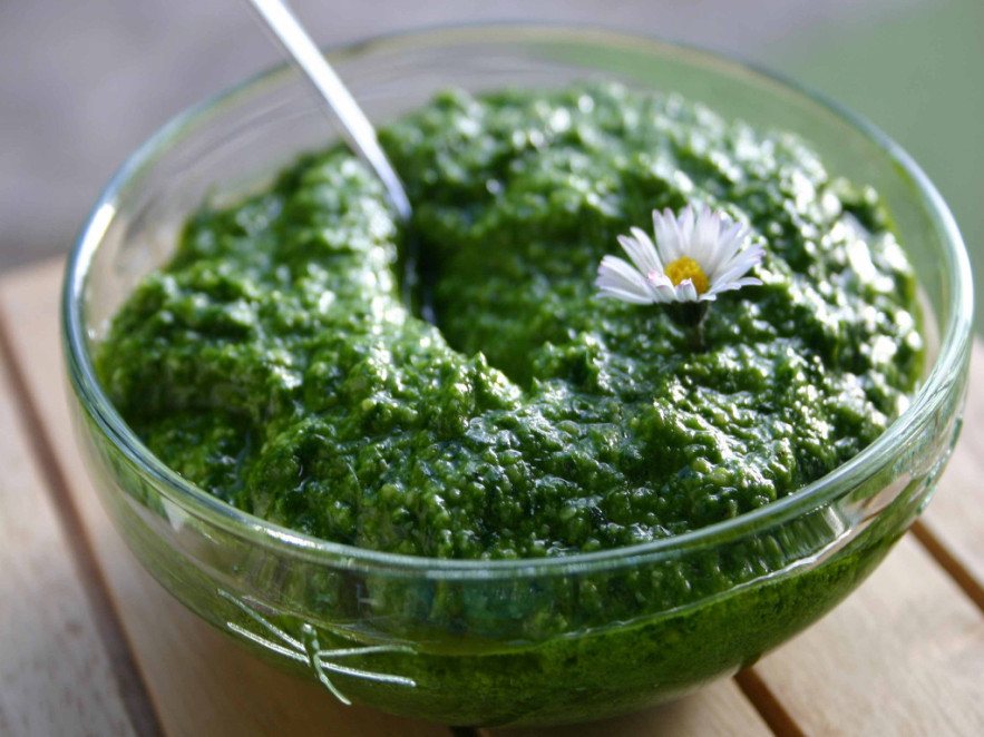 Kb. 30 levelet megmosunk és lecsöpögtetünk, majd egy éles késsel nagyon apró darabokra vágjuk, mintha petrezselymet aprítanánk. Robotgéppel is elvégezhetjük ezt a műveletet, de ügyeljünk arra, hogy ne pépesítsük el.