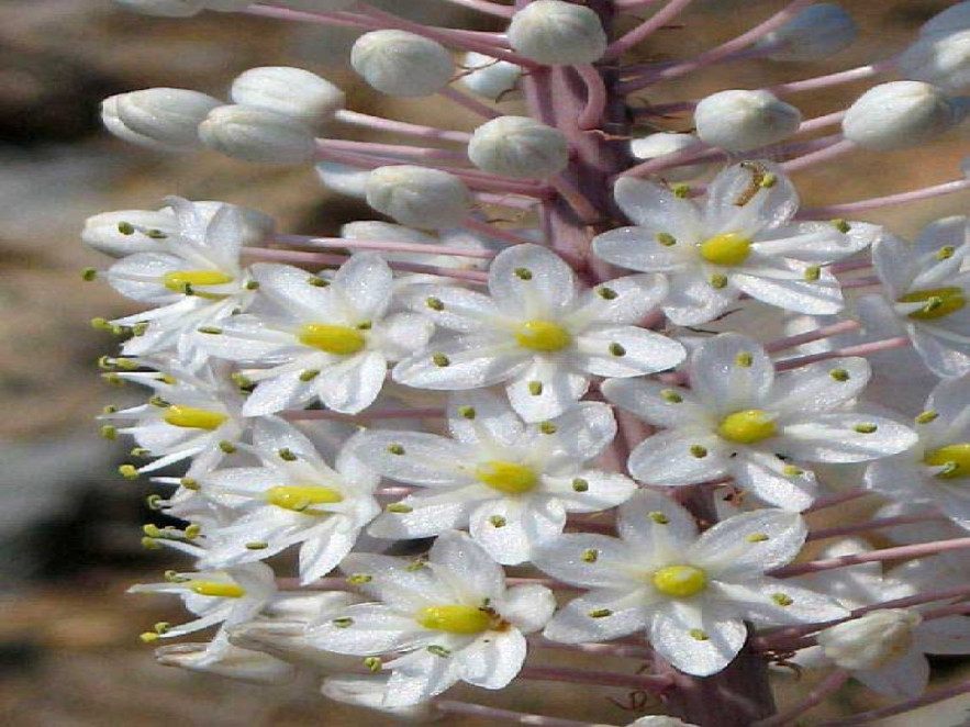 A tengeri hagymának egyetlen virágzó hajtása van, ez díszíti az alatta levő nagy leveleket, a fehér virágú változatnak pedig sűrű szakálla. A tengeri hagyma levél nélküli lilás szárának tetején halvány vagy rózsaszínes fürtös virágzat nő. Évente egyszer virágzik, a virágzat 30-60 cm hosszan helyezkedik el a kocsány végén. A virágzat egyedi, olyan értelemben, hogy a virágok fürtökben nyílnak alulról felfelé.