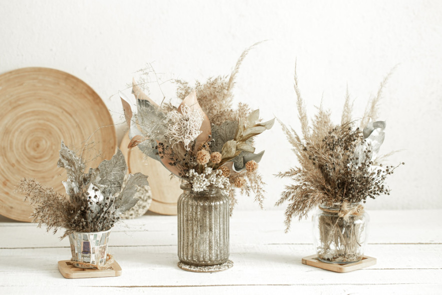 Az asztali kompozíciók új értelmet nyernek a szárított virágokkal. Vázában, tálban vagy akár üvegbúra alatt is elhelyezhetjük őket. Nagy előnyük, hogy nem kell cserélni a vizet, és hetekig, hónapokig gyönyörködhetünk bennük.
