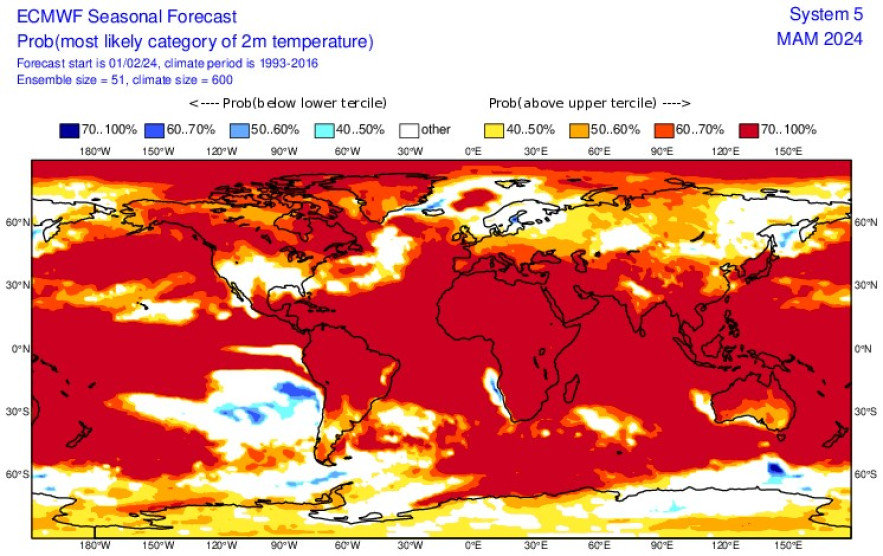 Az ECMWF modell tavaszi szezonális globális előrejelzése (a legvalószínűbb hőmérséklet anomália 2 méter magasságban)