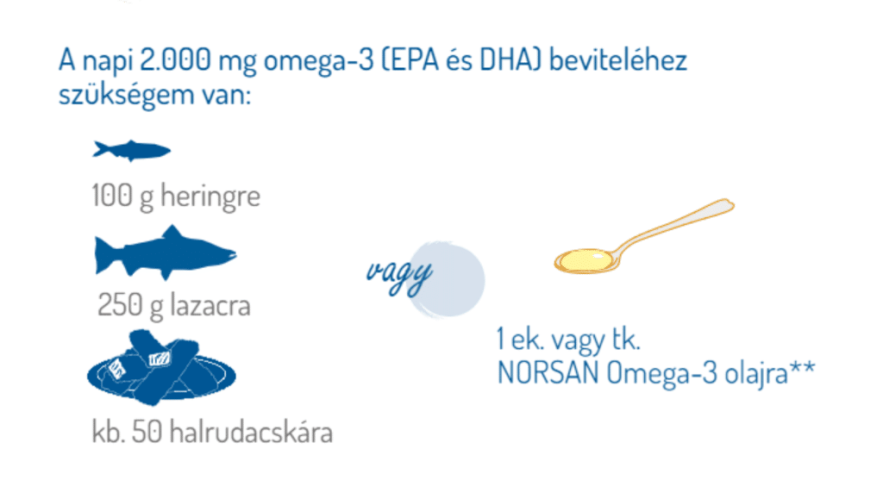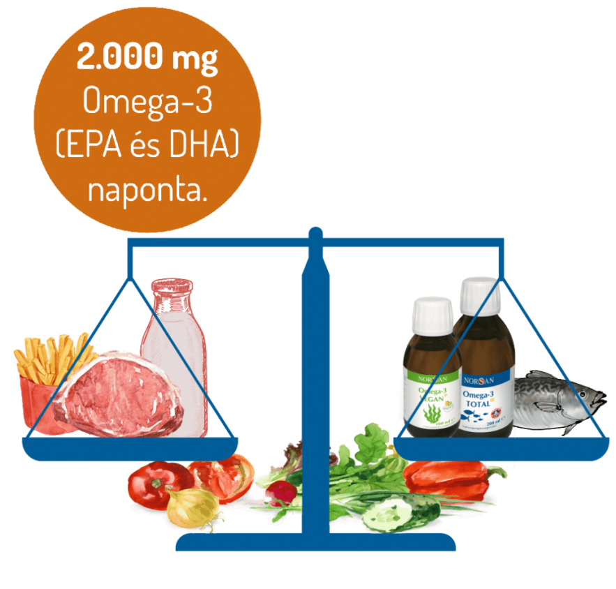 Jó alternatíva lehet ezért a jó minőségű, a káros anyagoktól gondosan megtisztított hal- vagy algaolaj rendszeres szedése. A NORSAN folyékony omega-3 olajokkal például napi egy kanálnyi elegendő a 2000 mg omega-3 szükséglet fedezésére. A hatékonyság növelése érdekében ezzel egyidejűleg csökkenteni kell az omega-6-ban gazdag élelmiszerek fogyasztását.