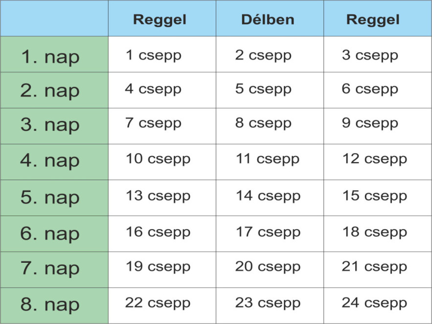 A cseppet naponta háromszor, egyre növekvő adagban kell beszedni, az alábbi táblázat alapján: