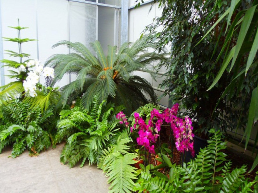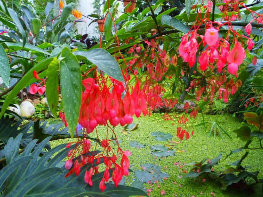 Rengeteg szobanövényként ismert virág is van a trópusi kertben, filodendronok, legyezőpálmák, vitorlavirág, flamingó minden színben, vizi pálma, cikász, szobafenyő, papagájvirág, meg egy csomó minden még, aminek nem is tudom a nevét. :)
