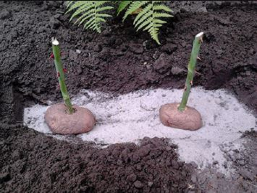 4. Az így előkészített és a burgonyába beledugott dugványt tegyük az kiásott gödörbe és fedjük be a föld kétharmadával, vigyázva arra, hogy a burgonya a homokos részbe kerüljön. A levegő kiszorítására a burgonya körül nyomkodjuk körbe a homokot.