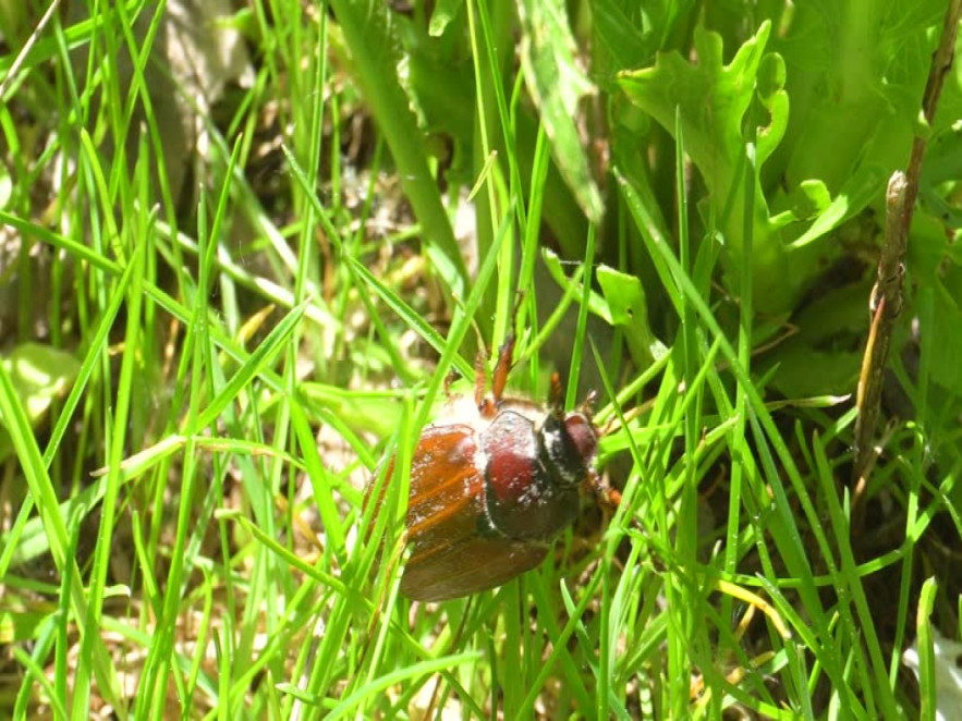 A gyep épen maradt részén pohárnyi foltokban sárgult a fű, és némelyik ilyen foltban elpusztult cserebogarat is találtunk.
