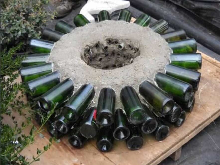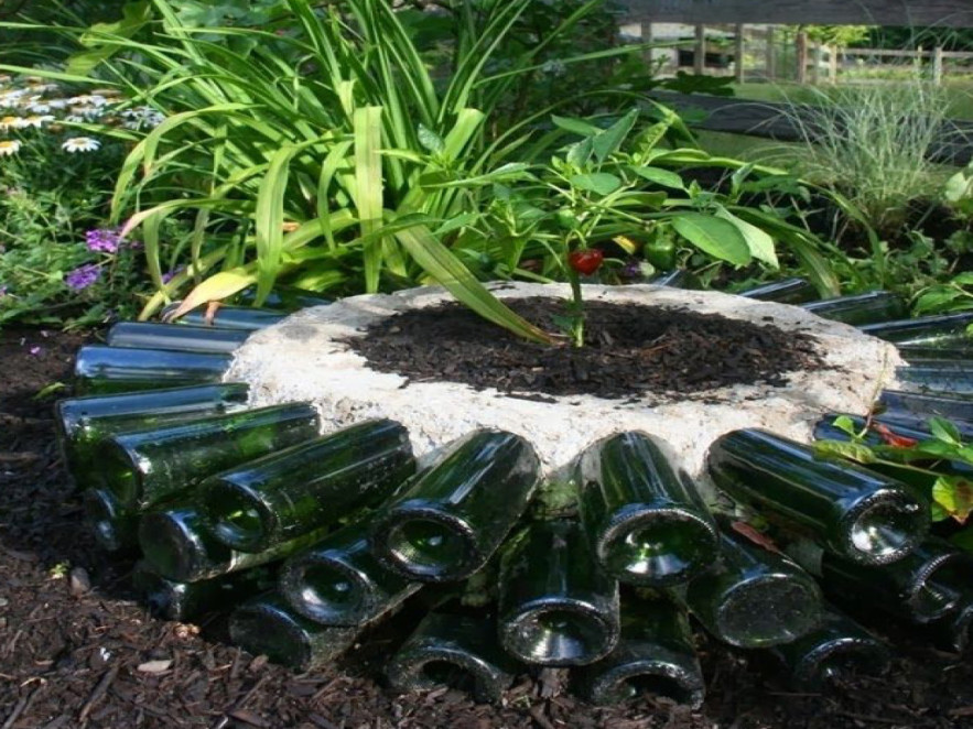 - Jelöljük ki, mekkora ágyást szeretnénk, majd a körvonalra először helyezzünk egy réteg földet vagy betont és erre rakjuk az első sor palackot úgy, hogy a szájuk az ágyás belsejébe nézzen, és pár centire belógjon a nyakuk a kijelölt körbe. A szájuk körül rögzítjük őket egy sor földdel vagy betonnal, úgy, hogy a palackok teste a lehető legnagyobb részben szabadon legyen. Ügyeljünk arra is, hogy a palackok szája ne tömődjön el. Ezután jöhet az újabb sor üveg.