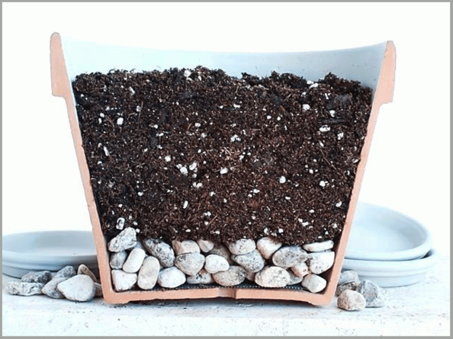 Mielőtt újraültetnénk a növényt, a cserép aljába rakjunk 2-3 centiméternyi apró kavicsot vagy agyagcserép törmeléket (a nagyobb cserepekbe lehet vastagabb rétegben is.) Ennek az a funkciója, hogy levezeti a felesleges öntözővizet a cserép-alátétbe, ezáltal megszűnik a pangó víz okozta folyamatos nedves közeg.