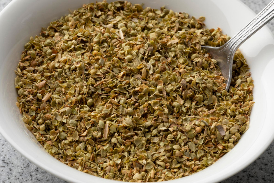 2 evőkanál szárított kakukkfű, 2 evőkanál pirított szezámmag, 2 evőkanál szumaklevel, 1 teáskanál só, 1 teáskanál őrölt koriander és opcionálisan 1 teáskanál szárított citromhéj. A szumak kissé savanykás, rubinvörös fűszer, ami keleti fűszerboltokban beszerezhető - ha nem találnánk, helyettesíthetjük citromlével savanyított pirospaprikával.
