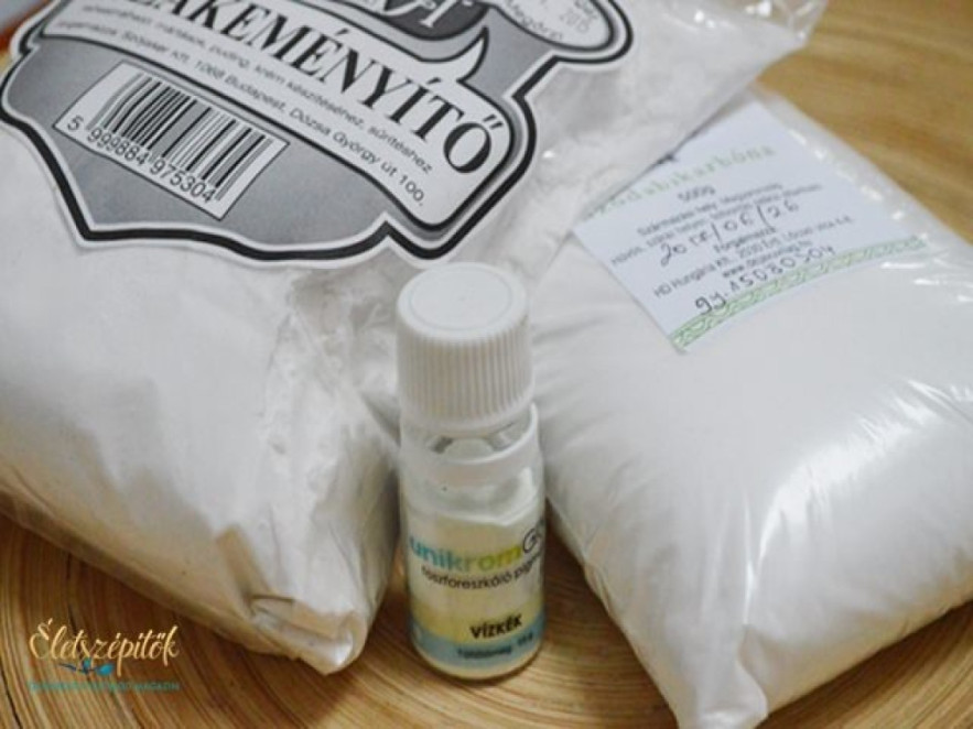 - 1/2 pohár étkezési keményítő (a fehér színű burgonya keményítő ideális hozzá, a kukorica alapú étkezési keményítők színe enyhén sárgás)