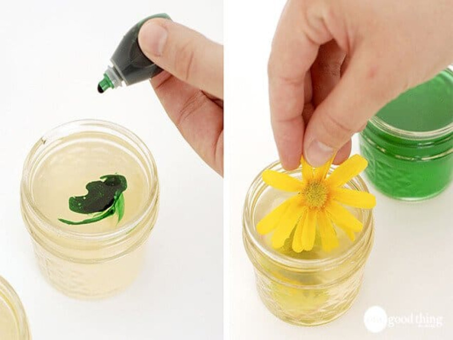 A zselatint forrald fel a vízben, add hozzá a választott színező anyagot, ha nem víztiszta zselét szeretnél, majd töltsd át az üvegedényekbe és hagyd kicsit hűlni.
