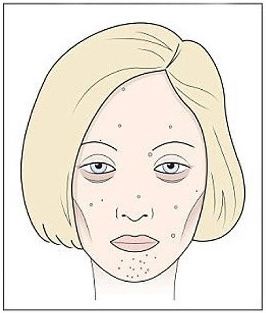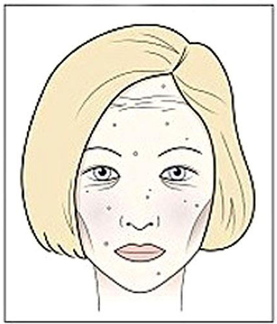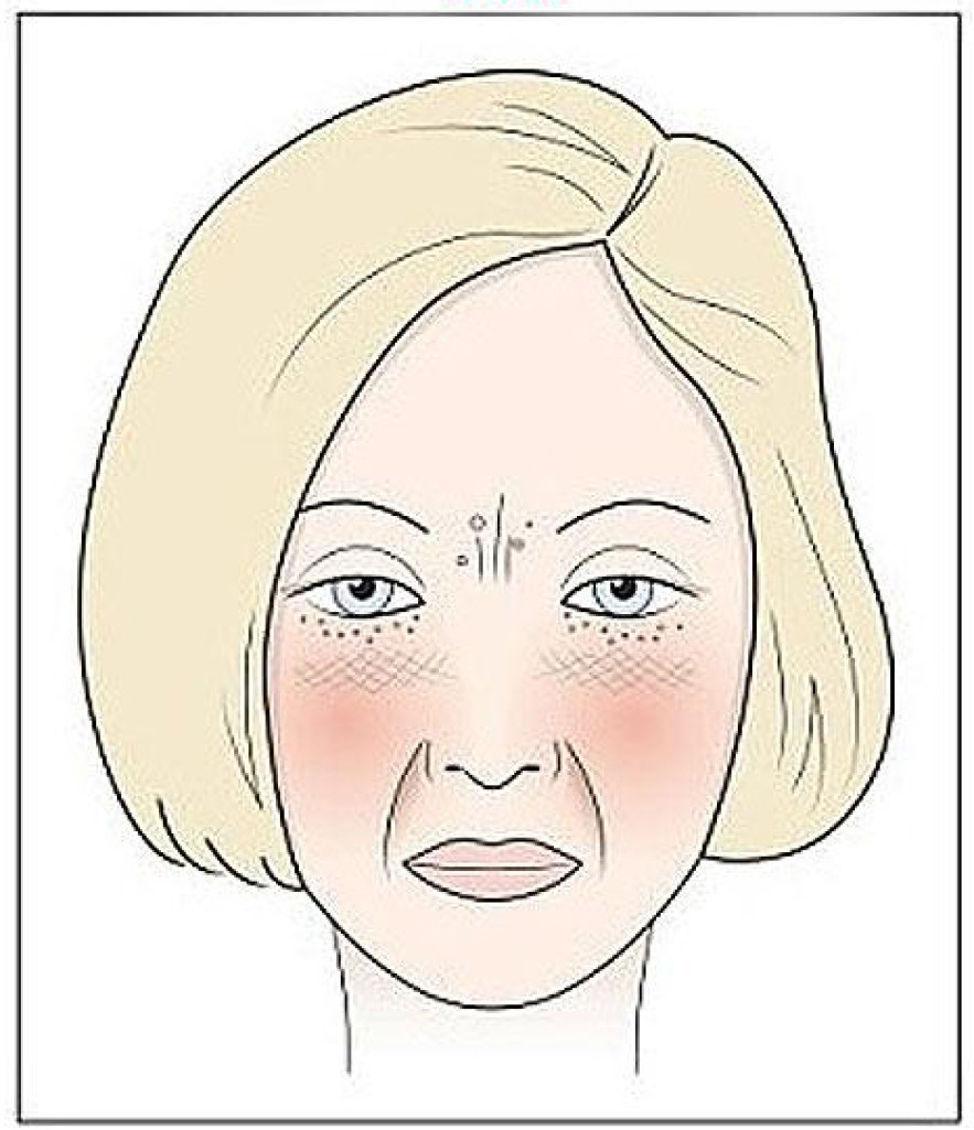 “A bor arc” bőrpír vagy kifejezett vonalak, a szemek között, kitágult pórusok, lankadt szemhéjak, száraz bőrt, seprűszerű vékony erek az arcon, és az orron, és mély ráncok.