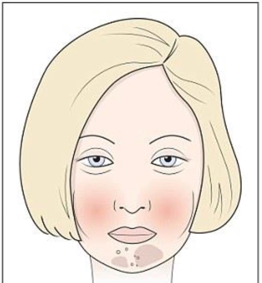 A “cukor arc” jelei közé tartoznak a korai ráncok és vízszintes vonalak a homlokon, a megereszkedett a szem alatti rész, fájdalmas göbös foltok, rossz bőrstruktúra, ami általában szürke vagy halvány fehér árnyalatú bőrt eredményez.