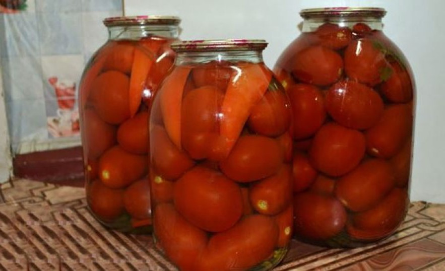 A befőttesüvegeket sterilizáljuk. Mossunk meg minden hozzávalót, majd rakjuk bele őket a befőttesüvegbe. Az üveg aljára tegyünk 1 - 2 gerezd meghámozott fokhagymát, 5 - 6 szál petrezselymet, majd rakjuk rá a paradicsomokat, ismét 1 - 2 gerezd fokhagymát tegyünk a paradicsomra és 3 - 4 szál petrezselymet. Szeleteljük fel a paprikát és ezt is tegyük a tetejére (tehetjük a befőttesüveg aljára is). Forraljunk vizet és öntsük rá a paradicsomra (annyi vízre van szükség, amennyi ellepi), hagyjuk állni 5 percet, majd öntsük le róla, egy edénybe és főzzük fel ismét. Időközben tegyük a befőttesüvegbe a cukrot, a sót és az ecetet is. Öntsük rá ismét a forró vizet, zárjuk le az üveget és takarjuk le egy meleg paplannal.
