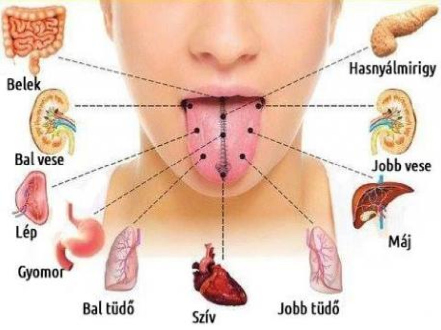 A nyelv csúcsán lehet látni a szívvel kapcsolatos panaszokat. Ettől két oldalt a tüdők, hörgők foglalnak helyet. Hátul a beleket és két oldalra vese bajra utaló jelek láthatóak.