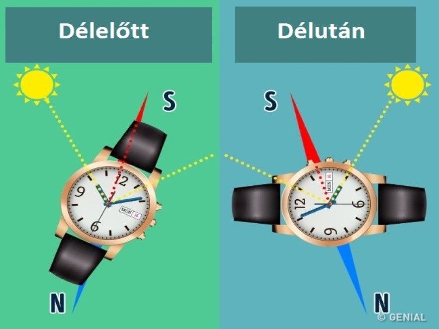 Persze nem az okosórát, ez annál régebbi trükk! Állj úgy, hogy az óramutató a Nap felé mutasson. Húzz egy képzeletbeli vonalat az egyeshez. Az egyes vonala és az óramutató vonala között lesz félúton dél. Délelőtt a Naptól jobbra lesz a déli égtáj, délután a Naptól balra.