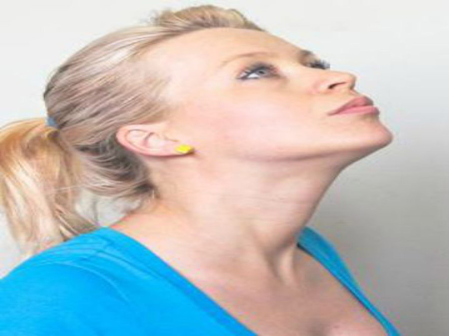 Próbáljuk az állunkat megérinteni vele, és tartsuk így, amíg 10-ig számolunk. Ismételjük a gyakorlatot naponta 10-szer. Hátrahajtott fejjel ugyanennyi gyakorlat javasolt.
