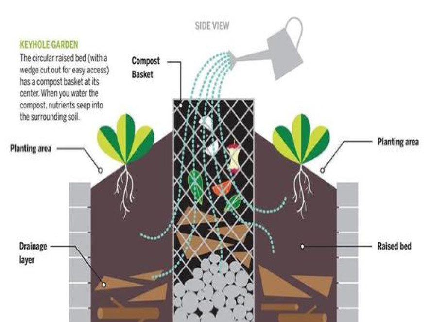 Lényegében egy magas ágyás, amit egy komposztkosáron keresztül öntözöl. Így biztosítható a folyamatos tápanyag ellátás. A neve onnan ered, hogy felülről nézve, olyan, mint a kulcslyuk.